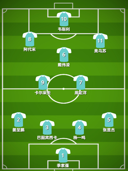 深圳新鹏城预测首发阵容:季家葆;姜至鹏、巴蒂班西卡、杨一鸣、张昱杰;卡尔采夫、周定洋、戴伟浚;阿代米、韦斯利、奥乌苏